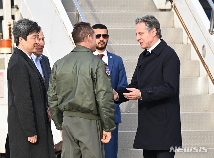 [평택=뉴시스] 김종택기자 = 토니 블링컨 미국 국무장관이 17일 오후 경기도 평택시 오산공군기지를 통해 입국해 관계자와 대화하고 있다. 블링컨 장관은 오는 18일부터 사흘간 서울에서 열리는 제3차 민주주의 정상회의 장관급 회의에 참석한다. 2024.03.17. [email protected]