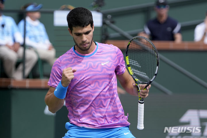 [인디언웰스=AP/뉴시스] 카를로스 알카라스(2위·스페인)가 17일(현지시각) 미 캘리포니아주 인디언웰스에서 열린 남자프로테니스(ATP) 투어 BNP 파리바 오픈 단식 결승전에서 다닐 메드베데프(2위·러시아)와 경기하고 있다. 알카라스가 2-0(7-6 6-1)으로 승리하고 대회 2연패를 달성했다. 2024.03.18.