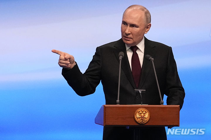 [모스크바=AP/뉴시스] 대선을 마친 블라디미르 푸틴 러시아 대통령이 18일 새벽(현지시각) 모스크바에 있는 선거운동본부를 찾아 연설하고 있다. 사상 최고의 득표율로 당선이 유력한 푸틴 대통령은 "이번 선거 승리로 러시아는 더 강력하고 효율적인 국가가 될 수 있을 것"이라고 강조했다. 2024.03.18.