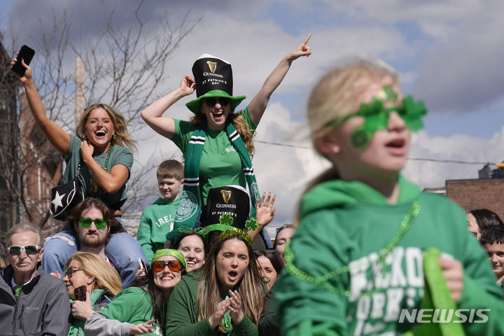 [보스턴=AP/뉴시스] 17일(현지시각) 미 매사추세츠주 보스턴에서 성 패트릭의 날 기념 행진이 열려 녹색 옷을 입은 시민들이 퍼레이드를 보면서 환호하고 있다. 성 패트릭의 날 축제는 아일랜드에 기독교를 전파한 패트릭 성인을 기념하는 것으로 매년 3월 17일에 열린다. 2024.03.18.