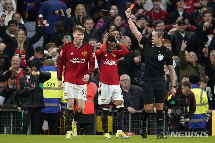 [맨체스터=AP/뉴시스] 맨체스터 유나이티드(맨유)의 아마드 디알로(가운데)가 17일(현지시각) 영국 맨체스터의 올드 트래퍼드 경기장에서 열린 2023-2024 잉글랜드축구협회(FA)컵 8강전 리버풀과의 경기 연장 후반 추가시간 결승 골을 넣은 후 경고 누적으로 레드카드를 받고 있다. 상의 탈의 세리머니로 경고받아 퇴장당한 디알로는 팀의 4-3 승리를 이끌었고 맨유는 결승에 올라 8년 만의 우승에 도전한다. 2024.03.18.