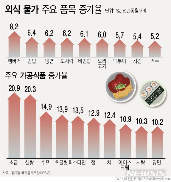 [그래픽] 외식 품목 가격 다 올랐다…33개월째 상승