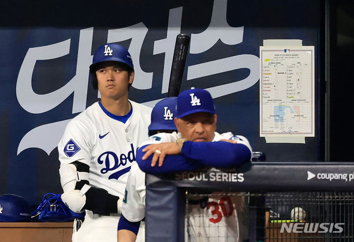 [서울=뉴시스] 김선웅 기자 = LA 다저스 오타니 쇼헤이가 18일 서울 고척스카이돔에서 열린 팀 코리아와 로스앤젤레스(LA) 다저스의 미국 프로야구(MLB) 서울시리즈 연습 경기, 5회말 더그아웃에서 타석에 들어설 준비를 하고 있다. (공동취재) 2024.03.18. [email protected]