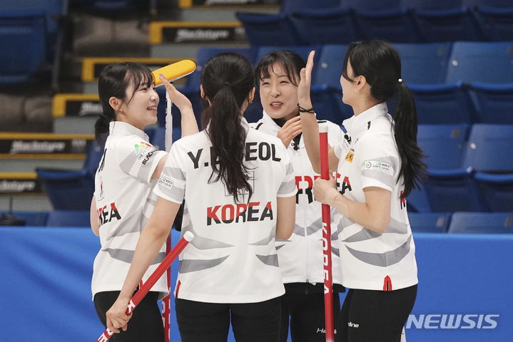 [시드니=AP/뉴시스] 여자 컬링 '팀 5G' 선수들이 18일(현지시각) 캐나다 노바스코샤주 시드니에서 열린 2024 세계 여자컬링 선수권대회 리그 4차전에서 일본에 승리한 후 자축하고 있다. 한국이 9-4로 일본을 꺾고 3승 1패를 기록했다. 2024.03.19.