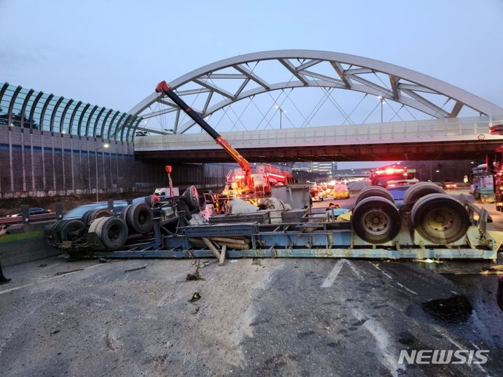 [성남=뉴시스] 19일 오전 5시 58분 경기 성남시 분당구 경부고속도로 양재방향 판교IC 인근에서 화물차 추돌 사고가 나 2명이 다쳤다. (사진=경기도소방재난본부 제공) 2024.3.19. [email protected]