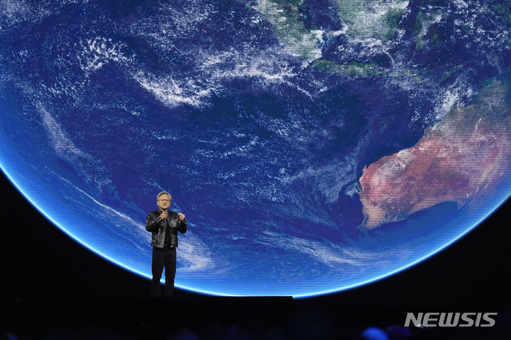 [새너제이=AP/뉴시스] 젠슨 황 엔비디아(NVIDIA) CEO가 18일(현지시각) 미 캘리포니아 새너제이에서 개막한 엔비디아 개발자 콘퍼런스 '엔비디아 GTC'에 참석해 인공지능(AI)과 기후에 대해 기조연설하고 있다. 2024.03.19.