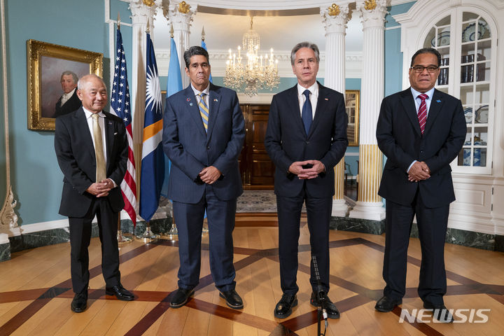 [워싱턴=AP/뉴시스]토니 블링컨 미 국무장관(오른쪽 2번째)이 2023년 9월16일 워싱턴 미 국무부 청사에서 잭 아딩 마셜군도 외무장관(왼쪽), 수란겔 휩스 주니어 팔라우 대통령(왼쪽 2번째), 웨슬리 시미나 미크로네시아 연방 대통령과 회담 전 기념촬영을 하고 있다. 미 관리들은 19일 마셜제도와 미크로네시아연방, 팔라우 등 전략적으로 중요한 태평양 섬나라 3국에 수십억 달러의 자금을 지원하는 법안이 승인된 것은 이 지역에 대한 미국의 의지를 보여주는 중요한 신호라고 강조했다. 법안 승인은 중국이 이 국가들을 미국의 영향권으로부터 떼내려고 적극적으로 노력하고 있다는 경고 속에 이뤄졌다. 2024.03.19.