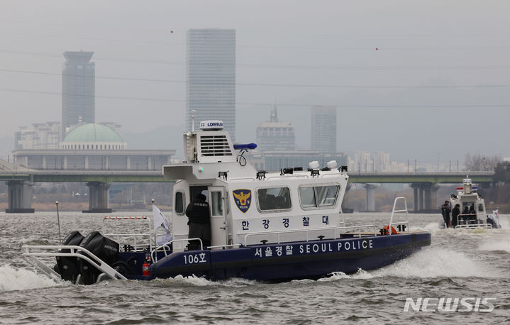 [서울=뉴시스] 정병혁 기자 = 19일 서울 마포구 망원본대 계류장에서 열린 한강경찰대 순찰정 진수식에서 한강경찰대 순찰정이 한강 물살을 가르고 있다.(공동취재) 2024.03.19. [email protected]