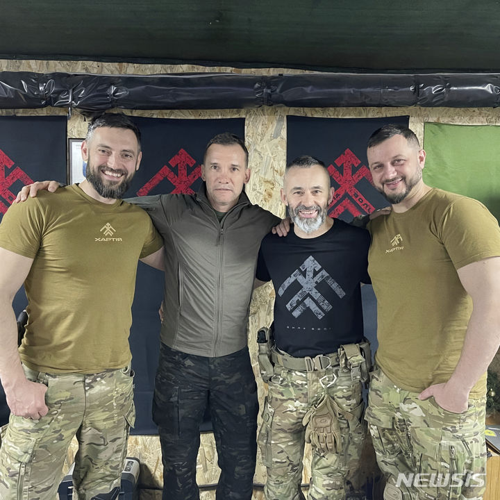 [쿠피안스크=AP/뉴시스] 우크라이나 축구의 전설이자 축구협회 회장인 안드리 셰우첸코(왼쪽 두 번째)가 18일(현지시각) 쿠피안스크의 국가방위군 13여단을 방문해 장병들과 기념 촬영하고 있다. 셰우첸코는 AC밀란(이탈리아)과 첼시(잉글랜드)에서 공격수로 활약했고 우크라이나 축구 국가대표 감독을 지냈다. 2024.03.20.