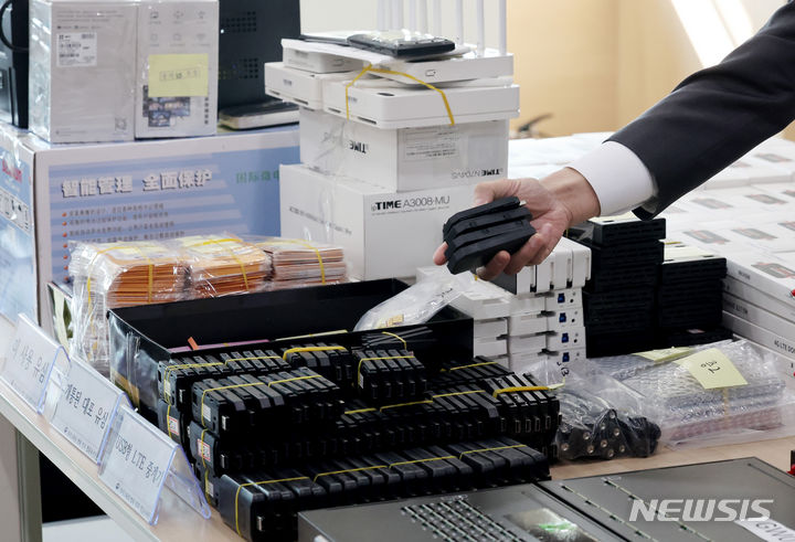 [서울=뉴시스] 김진아 기자 = 20일 오전 서울 송파구 서울동부지검에서 열린 '역대 최대규모 보이스피싱 발신번호 변작중계기 운영조직 적발' 브리핑에서 관계자가 압수물품을 정리하고 있다. 보이스피싱 범죄 정부합동수사단은 중국, 태국, 남아공 등 다국적 외국인으로 구성된 역대 최대규모의 보이스피싱 발신번호 변작중계기 운영조직을 적발, 단순 중계기 관리책뿐 아니라 간부급인 수당지급책, 부품보관소 관리책, 환전책 등 총 21명을 검거하여 구속기소 했다고 밝혔다. 2024.03.20. [email protected]