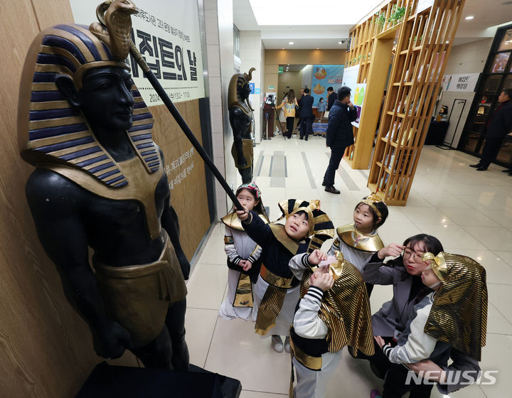 [서울=뉴시스] 김진아 기자 = 20일 서울 송파글마루도서관에서 열린 '이집트의 날' 행사에서 어린이들이 이집트 전통 의상 입기 체험을 하고 있다. 이날 행사에서는 세계 최초 아랍어와 한글 캘리그래퍼 소피아 엘콜리 교수와 함께하는 캘리그래피 체험, 파피루스 상형문자로 내 이름쓰기 등 다양한 이집트 문화 체험이 마련됐다. 2024.03.20. [email protected]