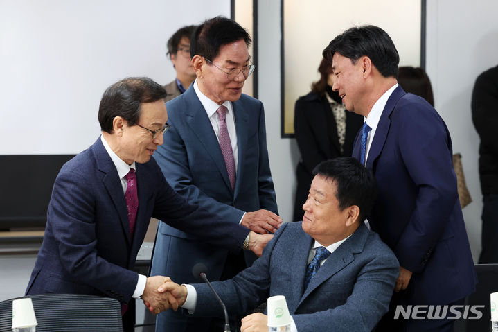 [서울=뉴시스] 홍효식 기자 = 버스·택시 업계 운송사업조합연합회 회장들이 20일 오후 서울 송파구 교통회관에서 열린 교통서비스 이용 활성화를 위한 업계(버스·택시) 간담회에 앞서 인사를 나누고 있다. 왼쪽부터 박권수 전국개인택시운송사업조합연합회 회장, 박복규 전국택시운송사업조합연합회 회장, 김기성 전국버스운송사업조합연합회 회장, 오성문 전국전세버스운송사업조합연합회 회장. 2024.03.20. [email protected]