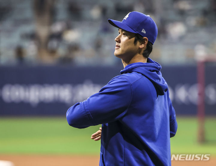 [서울=뉴시스] 정병혁 기자 = 20일 오후 서울 고척스카이돔에서 미국프로야구(MLB) 공식 개막전 LA다저스 대 샌디에이고 파드리스 경기에 앞서 LA다저스 오타니 쇼헤이가 훈련을 하고 있다. 2024.03.20. [email protected]