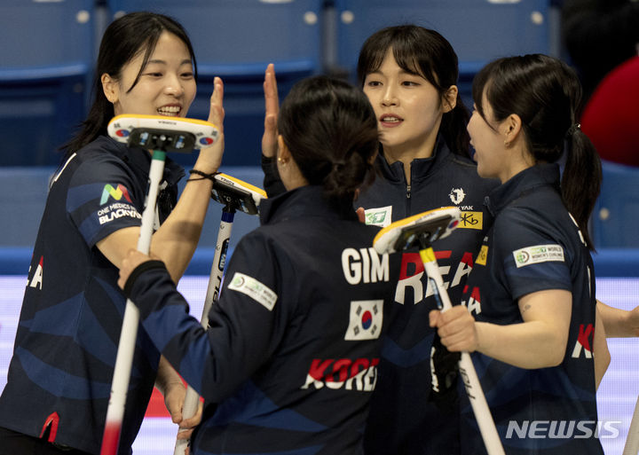 [시드니=AP/뉴시스] 여자 컬링 '팀 5G' 선수들이 21일(현지시각) 캐나다 노바스코샤주 시드니에서 열린 2024 세계 여자컬링 선수권대회 예선 9차전에서 노르웨이를 꺾은 후 자축하고 있다. 한국이 7-4로 승리해 7승2패로 4위를 기록 중이다. 이번 대회 예선 1,2위 팀은 준결승에 직행하고 3~6위 팀은 토너먼트를 통해 4강 진출 여부를 가린다. 2024.03.22.