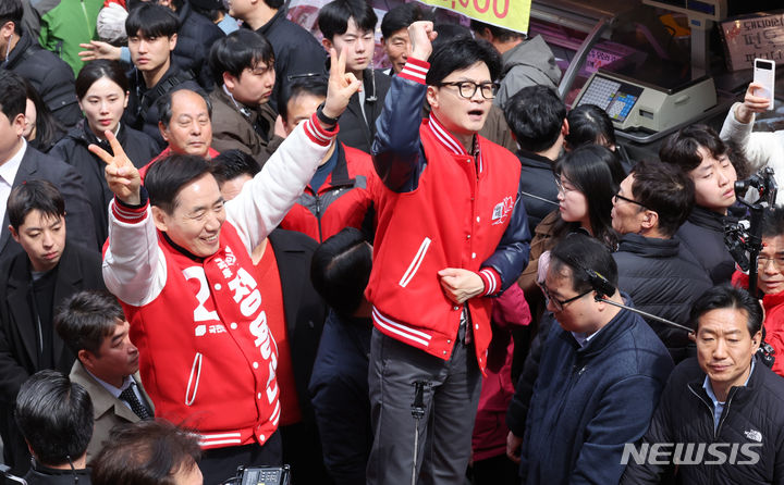[당진=뉴시스] 조성봉 기자= 한동훈 국민의힘 비상대책위원장이 22일 오후 충남 당진 전통시장에서 정용선 후보와 함께 시민들에게 인사하고 있다. (공동취재) 2024.03.22. [email protected]