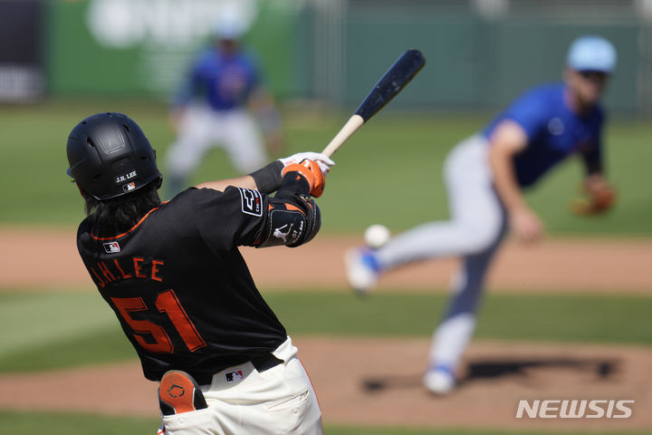 [스코츠데일=AP/뉴시스] 샌프란시스코 자이언츠의 이정후가 22일(현지시각) 미 애리조나주 스코츠데일 스타디움에서 열린 2024 미국프로야구(MLB) 시범 경기 시카고 컵스와 경기 4회 1타점 적시타를 치고 있다. 이정후는 4타수 2안타 1타점 2득점 1도루로 활약하며 팀의 13-12 승리를 견인했다. 2024.03.23.