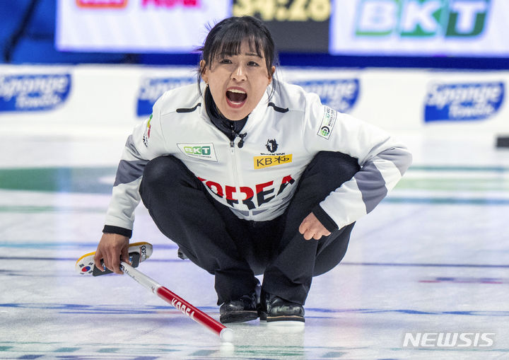 [시드니=AP/뉴시스] 여자 컬링 '팀 5G'의 스킵 김은지가 22일(현지시각) 캐나다 노바스코샤주 시드니에서 열린 2024 세계 여자컬링 선수권대회 예선 최종전 캐나다와 경기하고 있다. 한국은 무패를 기록하던 캐나다를 6-5로 따돌리고 10승 2패를 기록, 이탈리아와 4강 결정전(PO)을 치른다. 2024.03.23.