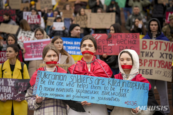 [키이우=AP/뉴시스] 24일(현지시각) 우크라이나 키이우에서 열린 우크라이나 전쟁 포로 석방 촉구 집회에 참석한 소녀들이 붉은 천으로 입을 막은 채 손팻말을 들고 있다. '아조우스탈 패밀리'가 주최한 이 집회 참가자들은 마리우폴에 억류 중인 우크라이나군 포로의 석방을 촉구했다. 2024.03.25.