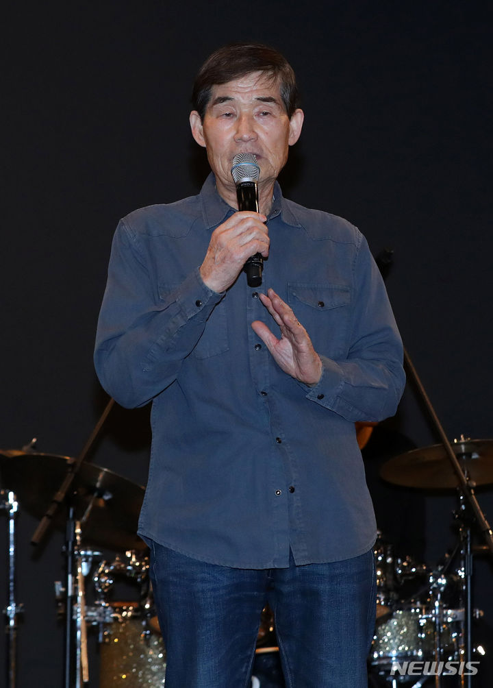 [서울=뉴시스] 김혜진 기자 = 가수 서유석이 27일 오전 서울 중구 서울시청 바스락홀에서 열린 신곡 시연회에서 '그들이 왜 울어야 하나' 무대를 선보이고 있다. 2024.03.27. [email protected]