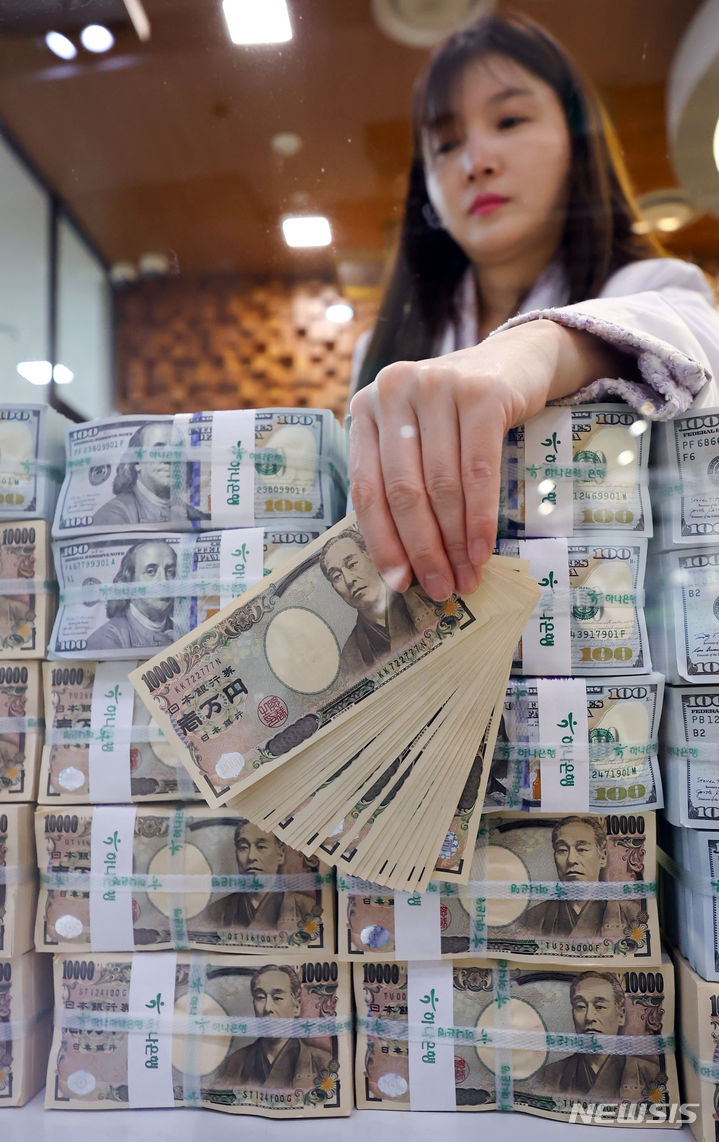 [서울=뉴시스] 최진석 기자 = 일본 엔화 약세가 지속되고 있는 27일 엔·달러 환율이 34년 만의 최고 수준인 151.97엔까지 올랐다. 지난 19일 일본은행이 마이너스 금리 해제를 발표했음에도 불구하고 엔화 가치는 지속적으로 하락했다. 151.5엔대 안팎에서 등락을 거듭하던 엔·달러 환율은 오전 10시 이후 151.7엔대로 급등했고, 약 2시간 이후에는 2022년 10월 기록한 151.94엔을 넘어섰다. 사진은 서울 중구 하나은행 위변조대응센터에서 직원이 엔화를 들어 보이는 모습. 2024.03.27. [email protected]