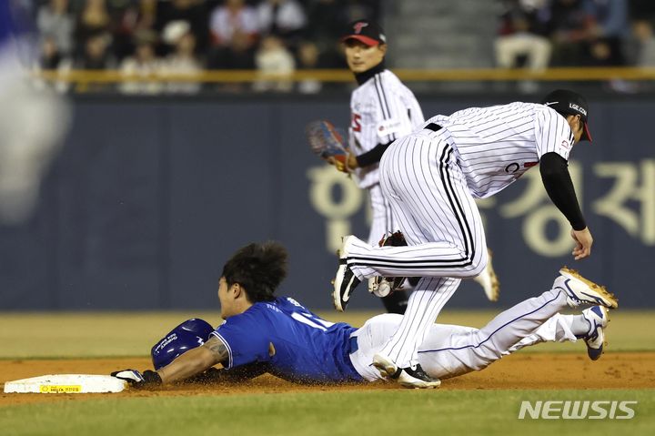 [서울=뉴시스] 정병혁 기자 = 27일 서울 송파구 잠실야구장에서 열린 2024 신한 SOL 뱅크 KBO리그 삼성 라이온즈와 LG 트윈스의 경기, 2회초 무사 주자 없는 상황 삼성 김현준 타석 때 1루 주자 류지혁이 2루로 도루하던 도중 LG 유격수 오지환과 충돌하고 있다. 2024.03.27. [email protected]