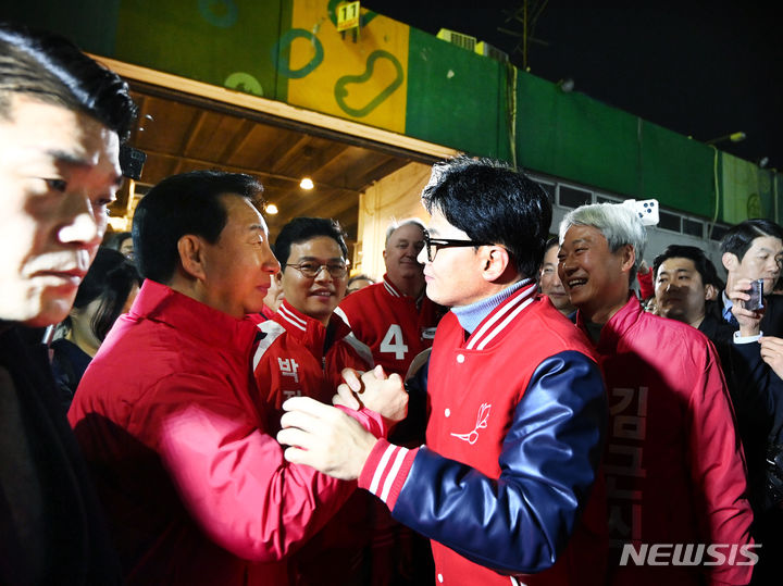 [서울=뉴시스] 조성봉 기자= 한동훈 국민의힘 비상대책위원장이 28일 서울 송파구 양재대로 가락시장에서 가진 '국민의힘으로 민생살리기' 선거운동개시 민생현장 방문을 마치고 김성태 서울권역 공동선대위원장, 배현진(송파을), 박정훈(송파갑), 김근식(송파병) 후보, 인요한 국민의미래 선거대책위원장 등과 손을 맞잡고 있다.(공동취재) 2024.03.28. [email protected]