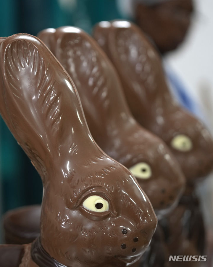 [요하네스버그=AP/뉴시스] 지난 27일(현지시각) 남아프리카공화국 요하네스버그의 겔도프 초콜릿 공장에 부활절의 상징인 '토끼' 모양의 초콜릿들이 포장을 기다리고 있다. 이 초콜릿 공장은 부활절 주말 수요를 충족하기 위해 '빛의 속도'로 제품을 쏟아내고 있다고 전했다. 2024.03.29.