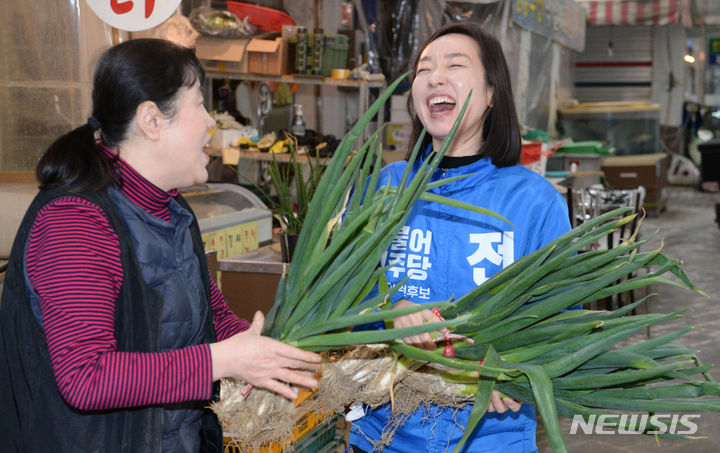 [울산=뉴시스] 배병수 기자 = 전은수 더불어민주당 남구갑 후보가 29일 오전 울산 남구 현대시장에서 대파를 구입 후 활짝 웃고 있다. 2024.03.29. [email protected]