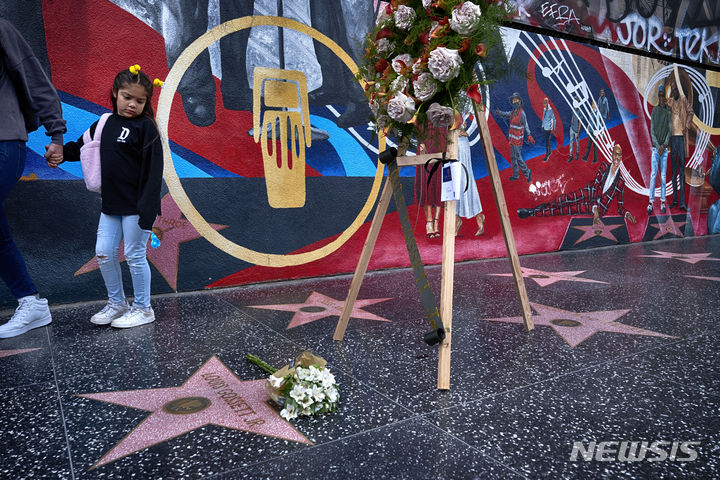 [로스앤젤레스=AP/뉴시스] 29일(현지시각) 미 캘리포니아주 로스앤젤레스의 할리우드 명예의 거리에 헌액된 배우 루이스 고셋 주니어의 별판에 그의 죽음을 애도하는 꽃이 놓여 있다. 영화 '사관과 신사'에서 혹독한 교관 역할로 흑인 최초로 아카데미 남우조연상을 받은 배우 루이스 고셋 주니어가 87세의 나이로 별세했다. 2024.03.30.