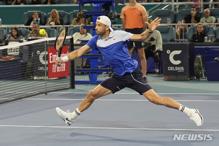 [마이애미=AP/뉴시스] 그리고르 디미트로프(12위·불가리아)가 29일(현지시각) 미 플로리다주 마이애미의 마이애미 가든스에서 열린 남자프로테니스(ATP) 투어 마이애미오픈 단식 준결승전에서 알렉산더 즈베레프(5위·독일)와 경기하고 있다. 카를로스 알카라스(2위·스페인)를 꺾고 올라온 디미트로프가 2-1(6-4 6-7 6-4)로 승리하고 결승에 올라 얀니크 신네르(3위·이탈리아)와 우승을 다툰다. 2024.03.30.