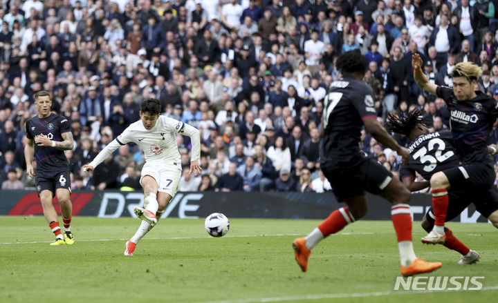 [런던=AP/뉴시스] 토트넘 홋스퍼의 손흥민이 30일(현지시각) 런던 토트넘 홋스퍼 스타디움에서 열린 2023-24시즌 잉글랜드 프리미어리그(EPL) 30라운드 루턴 타운과 경기 후반 41분 역전 결승 골을 넣고 있다. 손흥민은 리그 15호 골을 기록했고 토트넘은 17승5무7패(승점 56) 4위로 올라섰다. 2024.03.31.