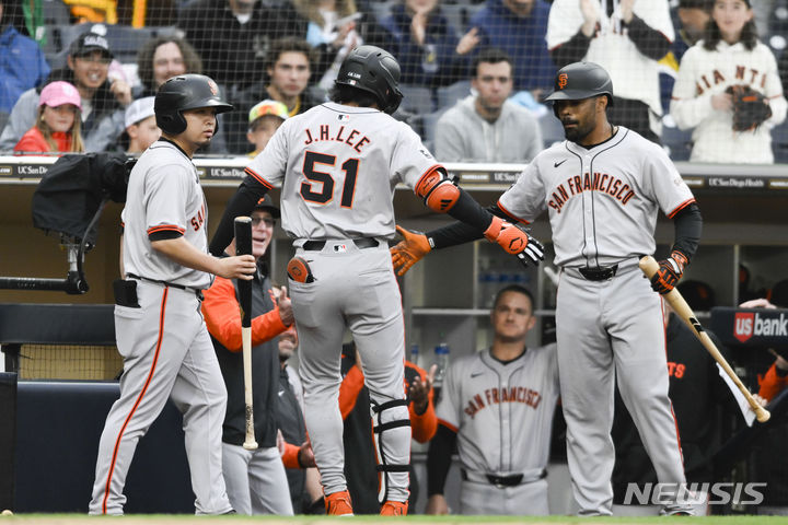 [샌디에이고=AP/뉴시스] 샌프란시스코 자이언츠의 이정후(51)가 30일(현지시각) 미 캘리포니아주 샌디에이고의 펫코파크에서 열린 2024 미국프로야구(MLB) 샌디에이고 파드리스와 경기 8회 초 우중월 1점 홈런을 친 후 동료들의 축하를 받고 있다. 이정후는 4타수1안타(홈런)2타점1득점을 기록했고 팀은 9-6으로 승리했다. 2024.03.31.