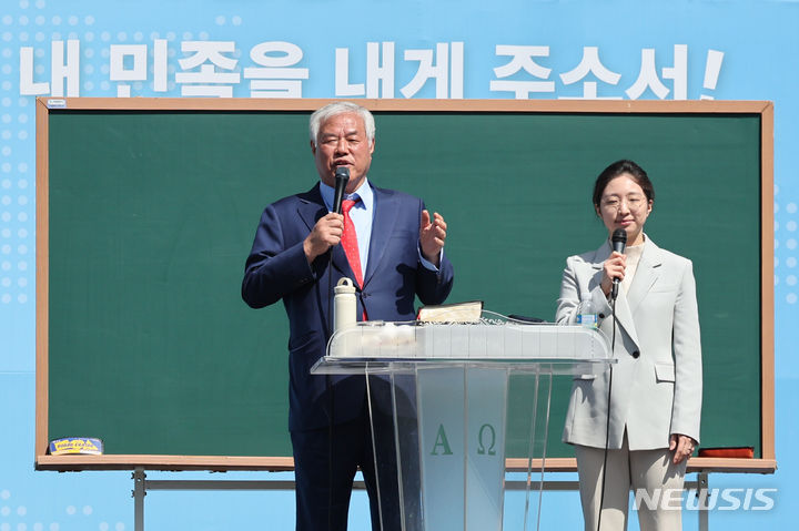 [서울=뉴시스] 권창회 기자 = 전광훈 사랑제일교회 목사가 31일 오전 서울 종로구 광화문네거리 인근에서 열린 전국주일연합예배에서 발언하고 있다. 2024.03.31. [email protected]