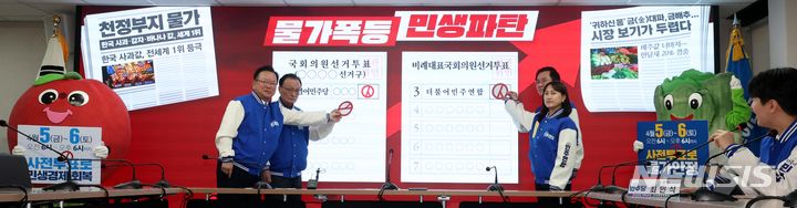 [서울=뉴시스] 조성봉 기자= 이해찬 더불어민주당 상임공동선대위원장을 비롯한 공동선대위원장들이 1일 오전 서울 여의도 더불어민주당 중앙당사에서 열린 중앙선거대책위원회의에서 사전투표 독려 퍼포먼스를 하고 있다. 2024.04.01. [email protected]