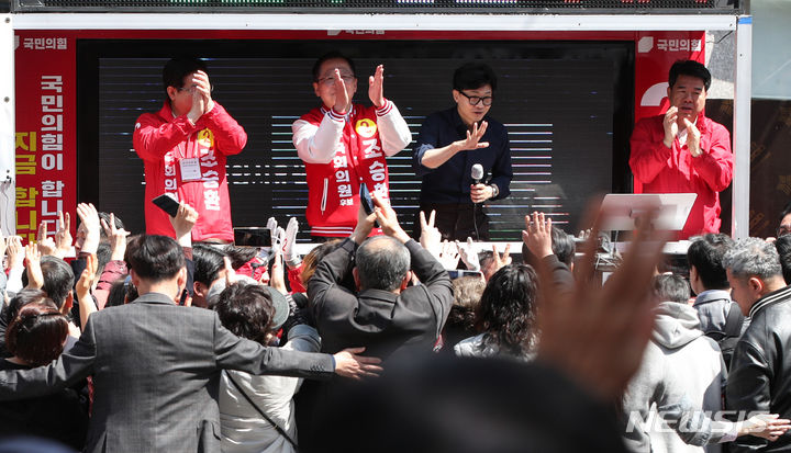 [부산=뉴시스] 추상철 기자 = 한동훈 국민의힘 비상대책위원장이 1일 오전 부산 영도구 남항시장 앞에서 열린 ‘국민의힘으로 중구영도살리기’ 지원유세에서 조승환 중구영도구 후보의 지지를 호소하고 있다. (공동취재) 2024.04.01. [email protected]