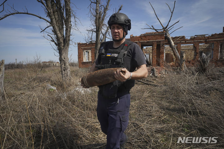 [발라클리야=AP/뉴시스] 1일(현지시각) 우크라이나 하르키우주 발라클리야 인근에서 우크라이나 공병대원이 크로아티아제 무인 지뢰 차량 DOK-ING MV-10이 찾아낸 불발탄을 회수하고 있다. 2024.04.02.