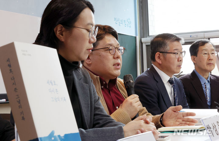 [서울=뉴시스] 조성우 기자 = 재단법인 진실의 힘 세월호 기록팀의 전치형 카이스트 과학기술정책대학원 교수(왼쪽 두 번째)가 3일 오전 서울 중구 상연재에서 열린 '세월호, 다시 쓴 그날의 기록' 출간 기념 기자간담회에서 발언하고 있다. 2024.04.03. [email protected]