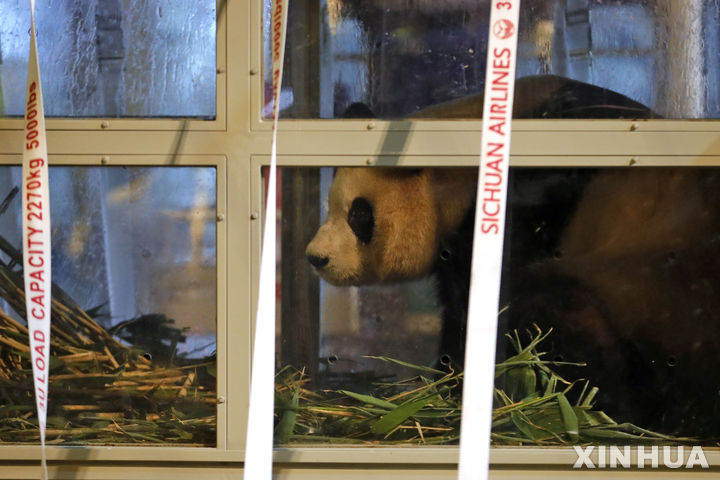 [청두=신화/뉴시스] 자이언트 판다 푸바오가 3일 중국 남서부 쓰촨성 청두 솽류국제공항에 도착해 있다. 푸바오는 자이언트판다보전연구센터 워룽 선수핑 기지에서 한 달간 격리하며 중국 생활을 적응할 예정이다. 2024.04.04.