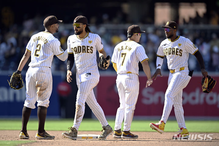 [샌디에이고=AP/뉴시스] 샌디에이고 파드리스의 김하성(7)이 3일(현지시각) 미 캘리포니아주 샌디에이고의 펫코파크에서 열린 2024 미프로야구(MLB) 세인트루이스 카디널스와의 경기를 승리로 마친 후 동료들과 자축하고 있다. 김하성은 3타수 1안타 1볼넷 1도루를 기록했고 팀은 3-2로 승리했다. 2024.04.04.