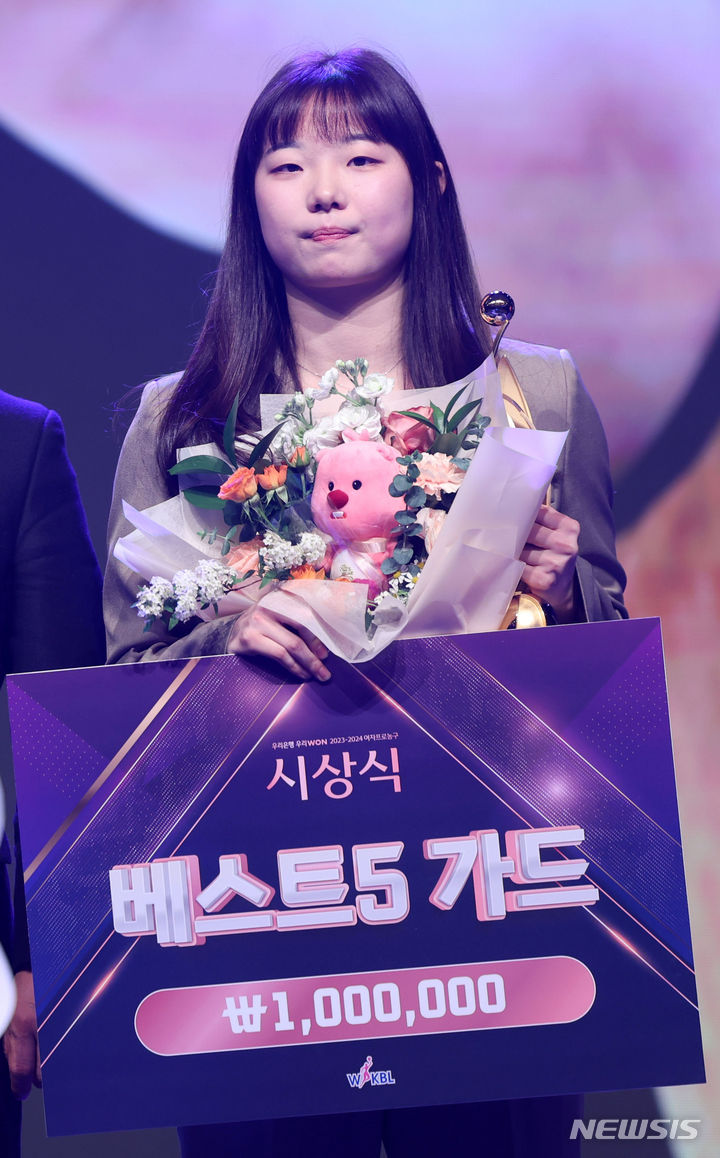 [서울=뉴시스] 김선웅 기자 = KB스타즈 허예은 선수가 4일 서울 여의도 63컨벤션센터에서 열린 우리은행 우리WON 2023-2024 여자프로농구 시상식에서 BEST 5 가드부문상을 수상하고 있다. 2024.04.04. [email protected]