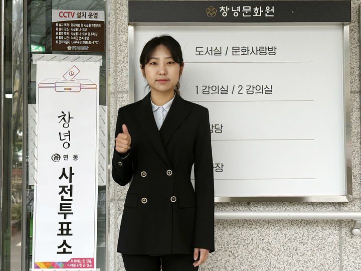 [창녕=뉴시스] 밀양·의령·함안·창녕 선거구에 출마한 더불어민주당 우서영 후보가 제22대 국회의원선거 사전투표일인 5일 오전 경남 창녕군 창녕읍 창녕문화원 별관에 마련된 사전투표소에서 투표를 마친 뒤 인증사진을 찍고 있다. (사진=우서영 후보 선거사무실 제공) 2024.04.05. [email protected]