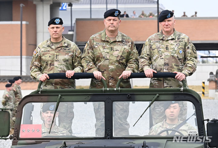 [평택=뉴시스] 김종택기자 = 미8군사령관 이취임식이 열린 5일 경기도 평택시 캠프 험프리스에서 크리스토퍼 C. 라니브 신임 미8군 사령관, 윌러드 M. 벌러슨 전임 사령관, 폴 J. 라캐머라 주한미군사령관(사진 왼쪽부터)이 부대를 사열하고 있다. 2024.04.05. [email protected]