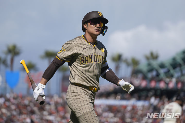 [샌프란시스코=AP/뉴시스] 샌디에이고 파드리스의 김하성이 5일(현지시각) 미 캘리포니아주 샌프란시스코의 오라클 파크에서 열린 2024 미프로야구(MLB) 샌프란시스코 자이언츠와 경기 9회 초 삼진 아웃당한 후 더그아웃으로 들어오고 있다. 김하성은 4타수 무안타 1삼진을 기록했고 팀은 2-3으로 패했다. 2024.04.06.