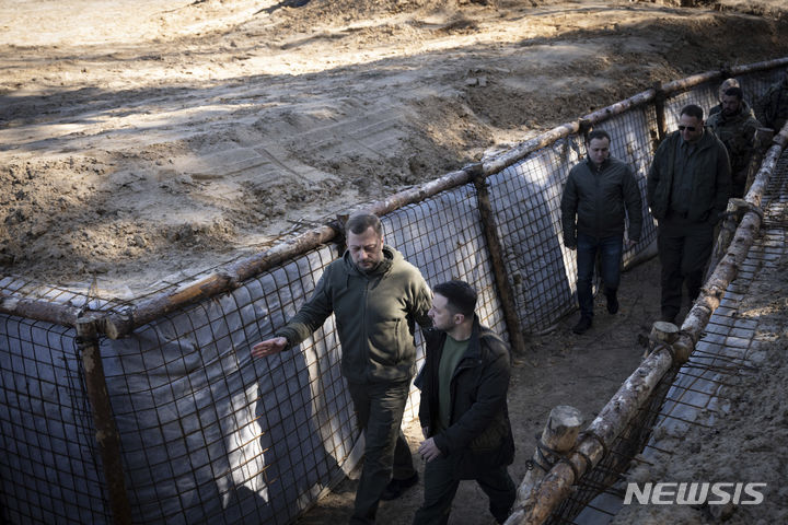 [체르니히우=AP/뉴시스] 우크라이나 대통령 공보실이 제공한 사진에 볼로디미르 젤렌스키(오른쪽) 대통령이 5일(현지시각) 우크라이나 체르니히우 전선을 방문해 진지를 둘러보고 있다. 2024.04.06.