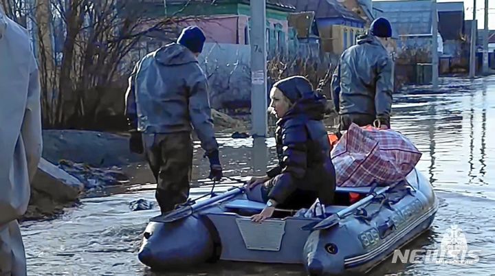 [오르스크=AP/뉴시스] 6일(현지시각) 러시아 오르스크의 우랄강 유역 댐 일부가 붕괴해 구조대원들이 지역 주민들을 대피시키고 있다. 앞선 5일 홍수로 댐 2곳이 터지면서 홍수가 발생, 주택 4400채가 침수되고 주민 대피령이 내려졌다. 2024.04.07.