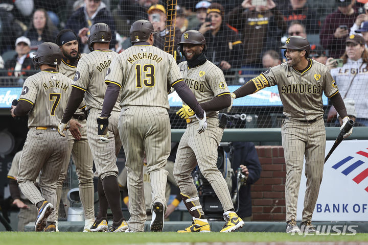 [샌프란시스코=AP/뉴시스] 샌디에이고 파드리스의 김하성(왼쪽)이 6일(현지시각) 미 캘리포니아주 샌프란시스코의 오라클 파크에서 열린 2024 미프로야구(MLB) 샌프란시스코 자이언츠와 경기 1회 초 볼넷으로 진루한 후 주릭슨 프로파(오른쪽 두 번째)의 만루 홈런으로 득점하고 있다. 김하성은 3타수 무안타 1볼넷 1득점을 기록했고 팀은 4-0으로 승리했다. 2024.04.07.