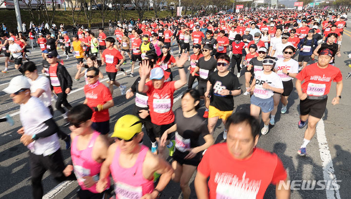 [대구=뉴시스] 이무열 기자 = 2024 대구국제마라톤대회가 열린 7일 오전 대구스타디움에서 마스터즈 10km 종목에 출전한 선수들이 힘차게 달리고 있다. 2024.04.07. [email protected]
