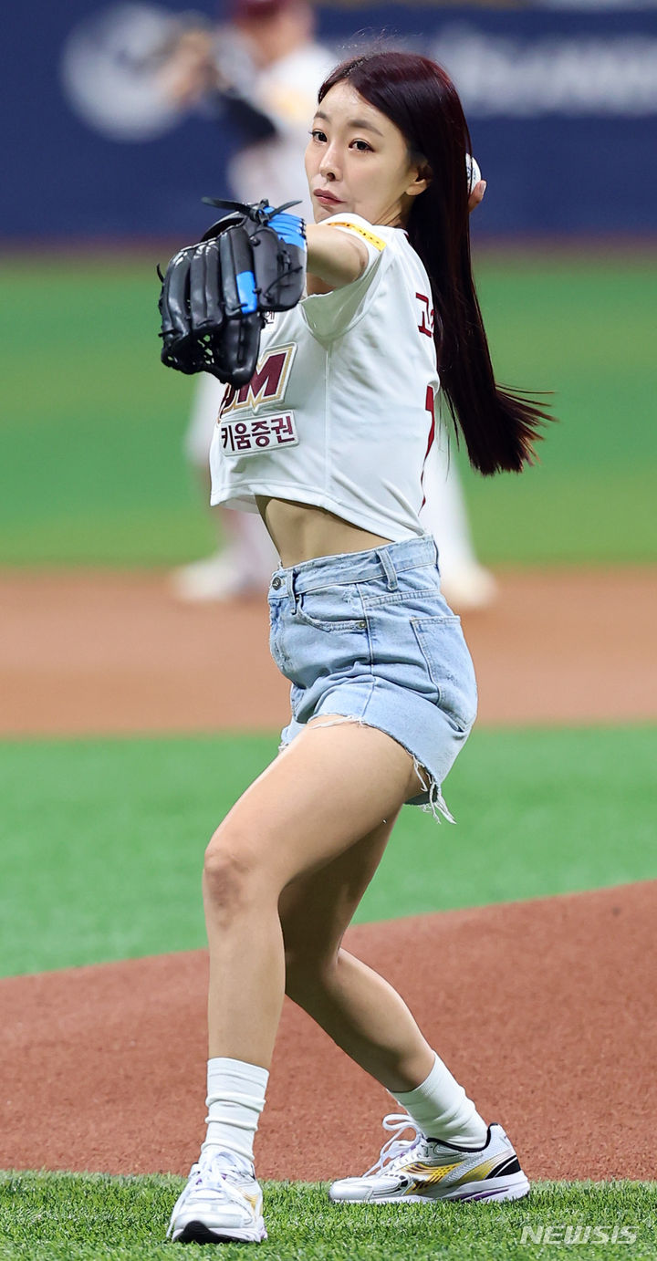 [서울=뉴시스] 최진석 기자 = 배우 고원희가 7일 서울 고척스카이돔에서 열린 '2024 KBO리그' 한화 이글스와 키움 히어로즈의 경기에 앞서 시구하고 있다. 2024.04.07. [email protected]