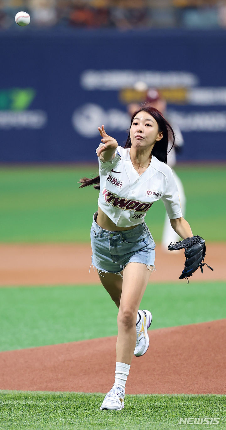[서울=뉴시스] 최진석 기자 = 배우 고원희가 7일 서울 고척스카이돔에서 열린 '2024 KBO리그' 한화 이글스와 키움 히어로즈의 경기에 앞서 시구하고 있다. 2024.04.07. [email protected]