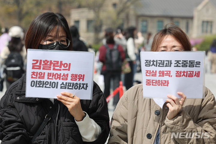 [서울=뉴시스] 권창회 기자 = 이화여대 동문들이 8일 오후 서울 서대문구 이화여대 정문 앞에서 김활란의 친일-반여성 행각을 직시하며 역사 앞에 당당한 이화인을 바라는 기자회견을 하고 있다. 2024.04.08. [email protected]